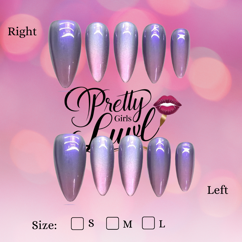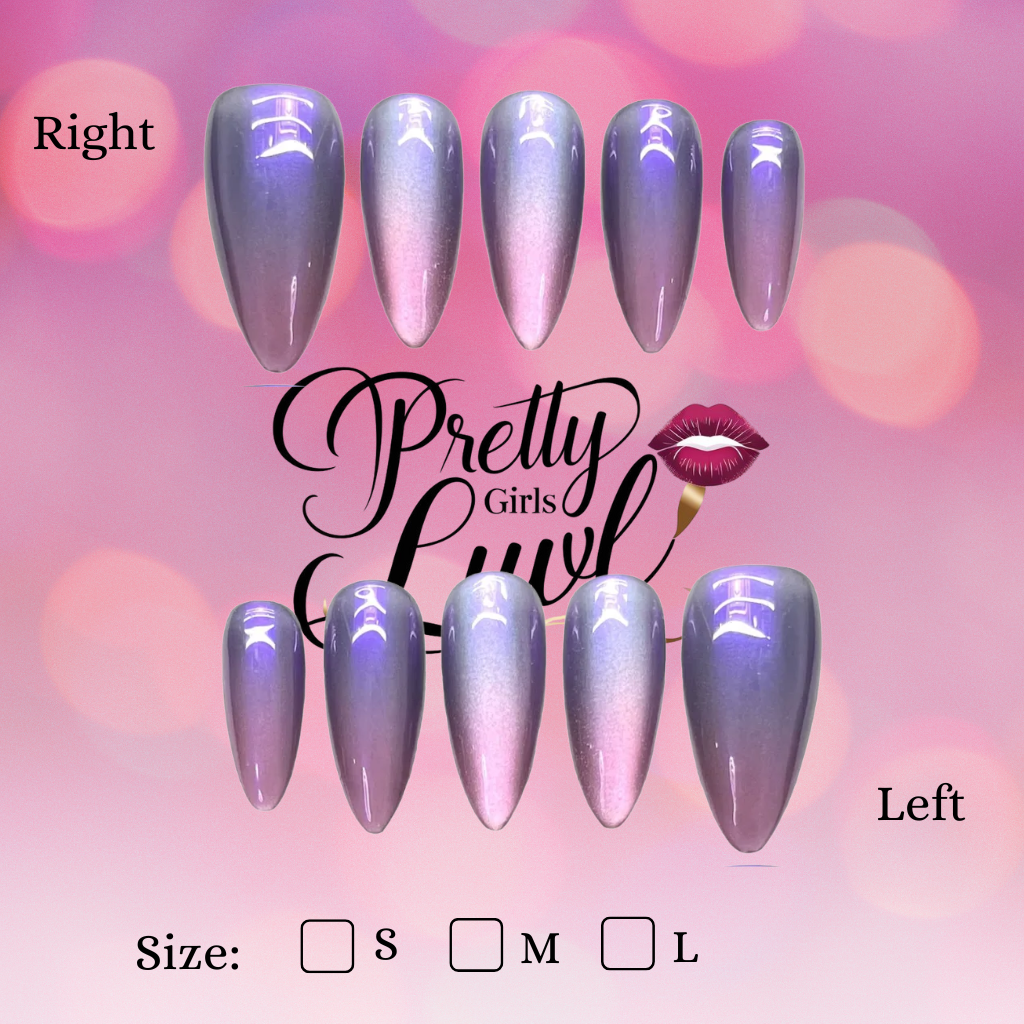 Achieve a magical, ever-changing manicure with this stunning Iridescent Plum press-on nail set. These handmade reusable nails feature a unique chrome cat-eye finish that shifts from rich purple to shimmering pink and lavender depending on the light. The beautiful almond shape and medium length offer an elegant, futuristic look. These are the perfect luxury press-on nails for making a statement. Salon quality, easy application, and includes a full kit.