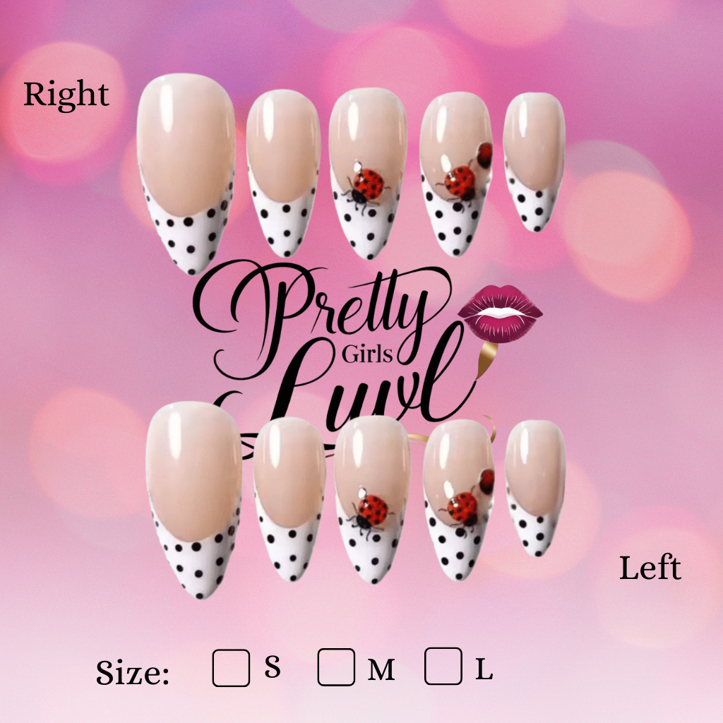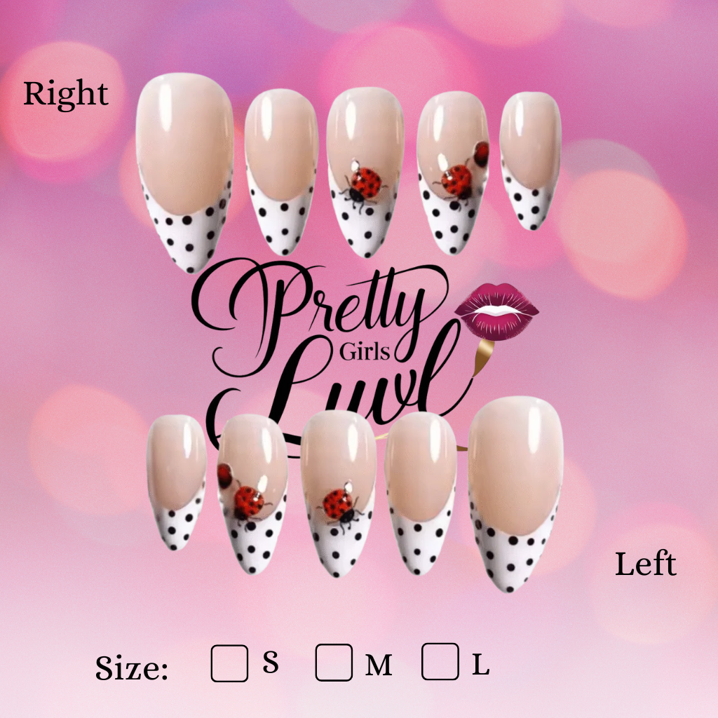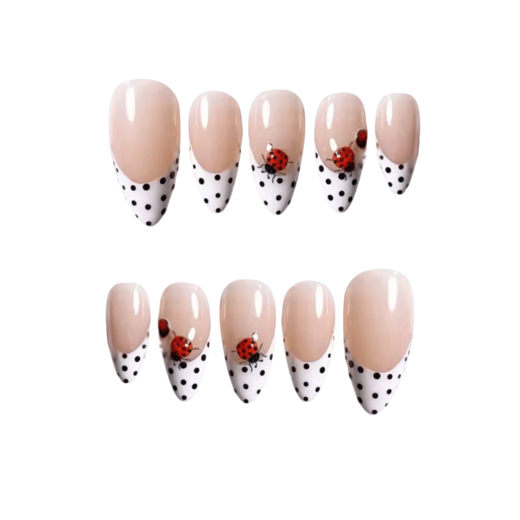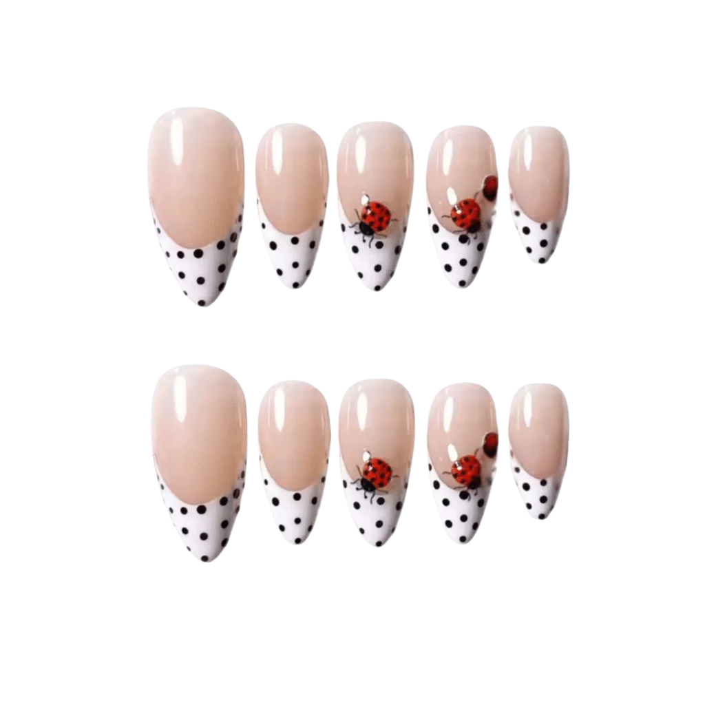 Add a dash of sweet vintage charm with the Ladybug Polka press-on nails. This delightful set features a classic French manicure with a playful twist: a crisp white tip adorned with tiny black polka dots. Each almond-shaped nail has a beautiful nude base, with select nails showcasing an adorable hand-painted ladybug design. Perfect for a picnic, a retro look, or just a burst of summer joy, this reusable set brings a whimsical elegance to your fingertips.