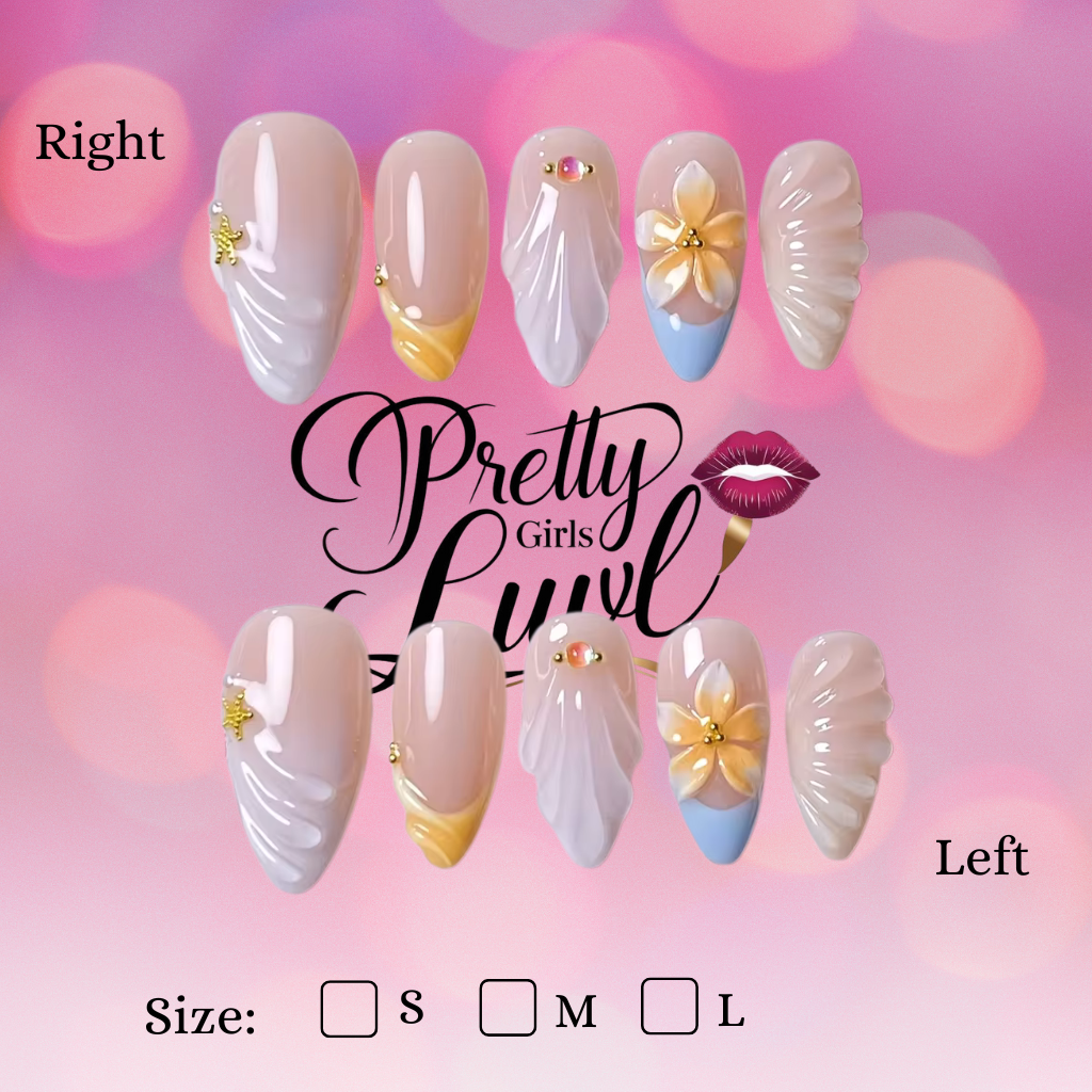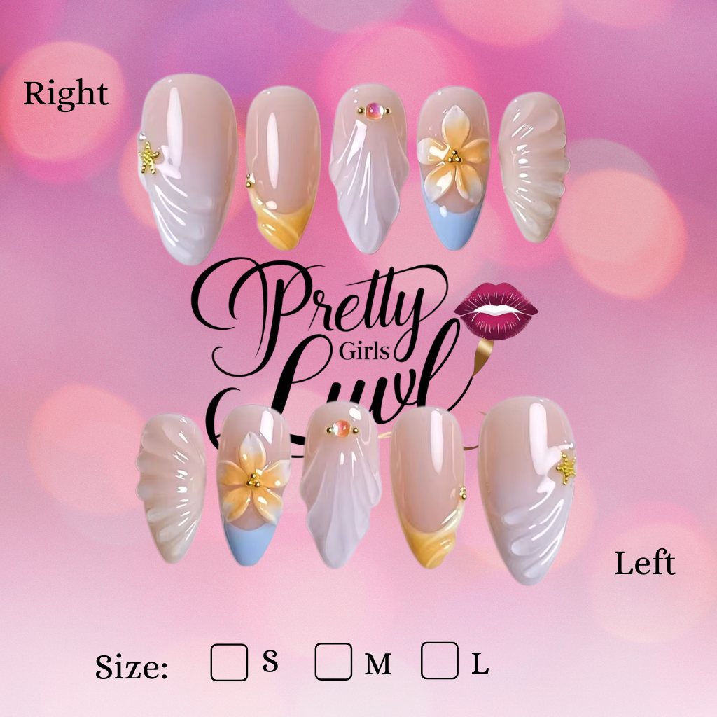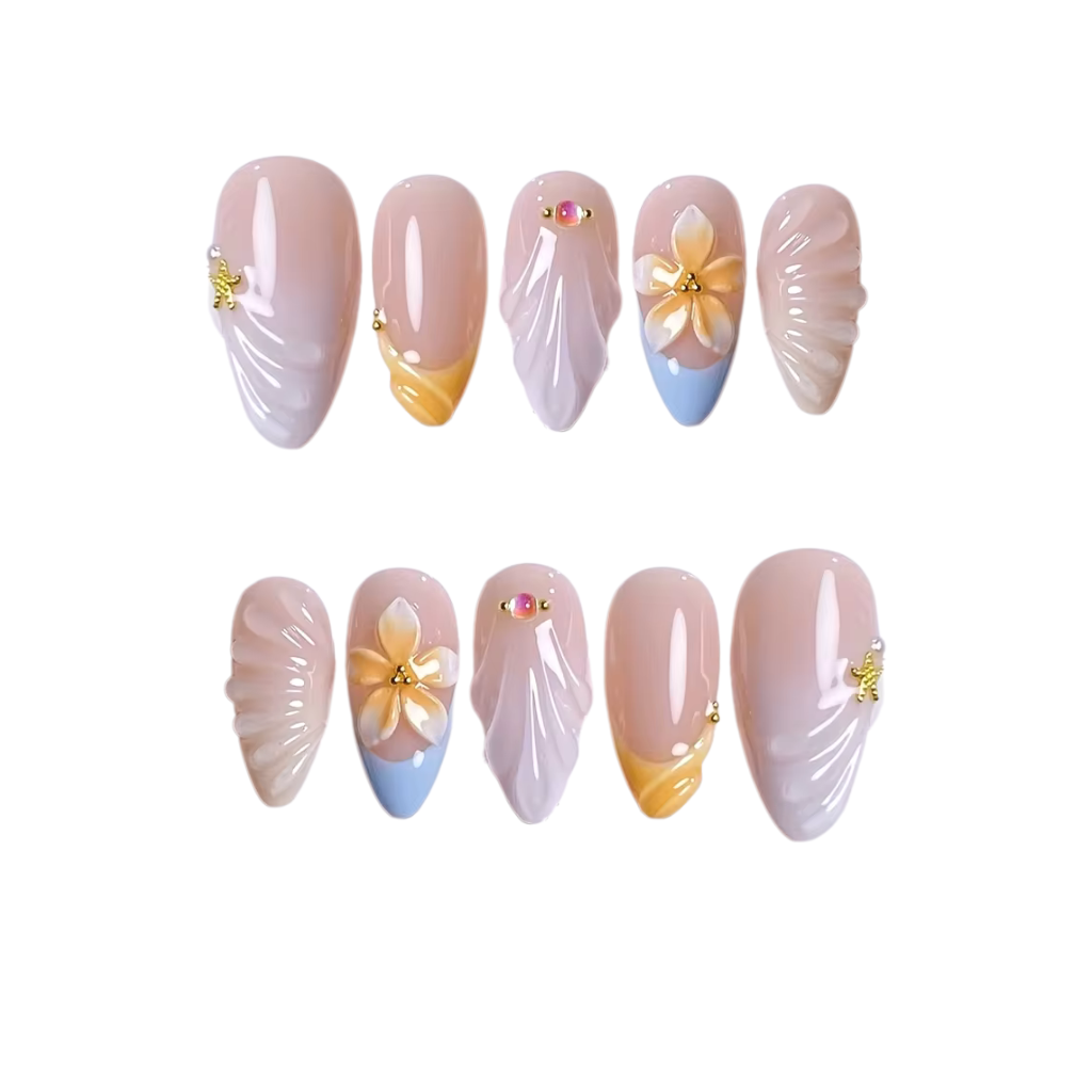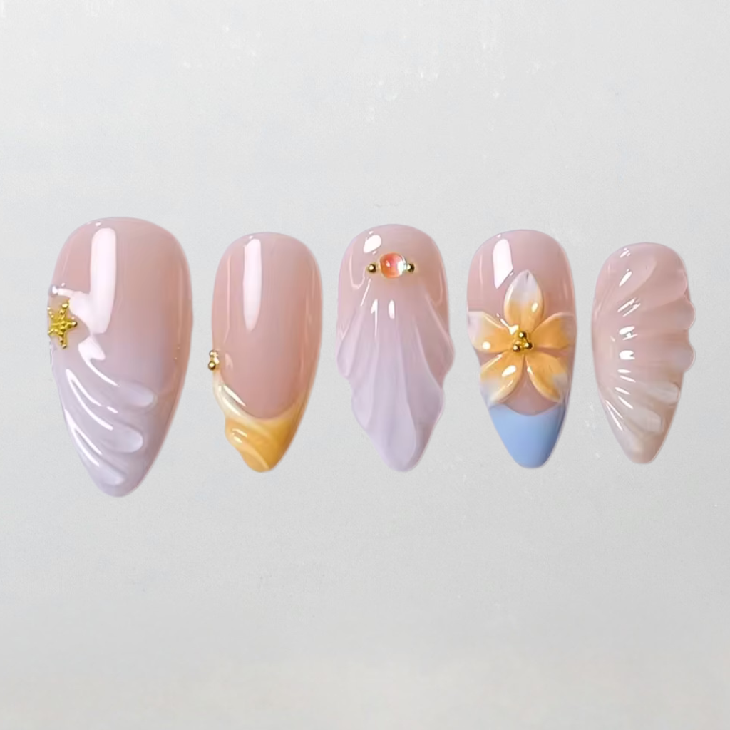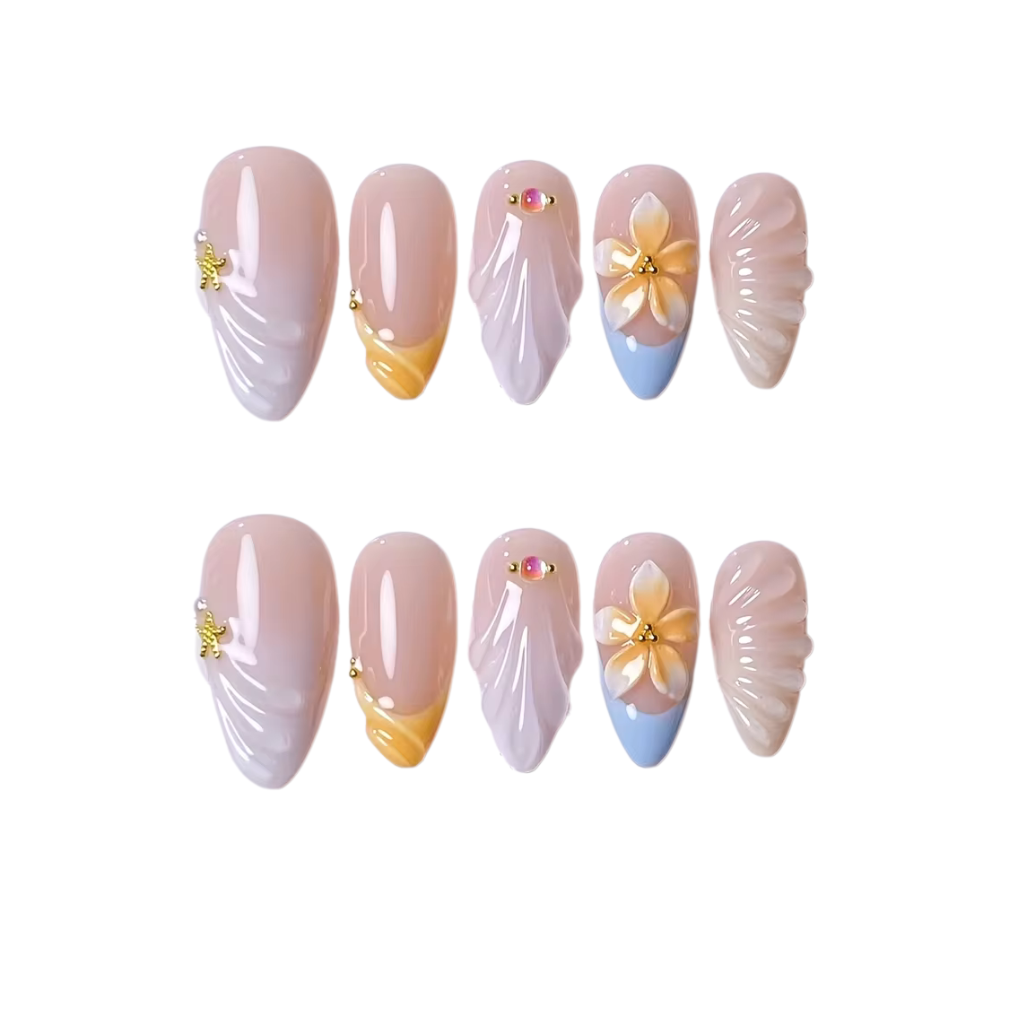 Drift away to a coastal dream with the Pastel Tide Pool press-on nails. This whimsical set features a soft nude base with a dreamy pink and lilac ombre, highlighted by sunny yellow and baby blue accents. Each almond-shaped nail showcases delicate hand-painted scallop and seashell motifs, along with shimmering golden studs and 3D floral accents. This reusable set is perfect for a light, ethereal look that brings the beauty of a quiet seaside to your fingertips.
