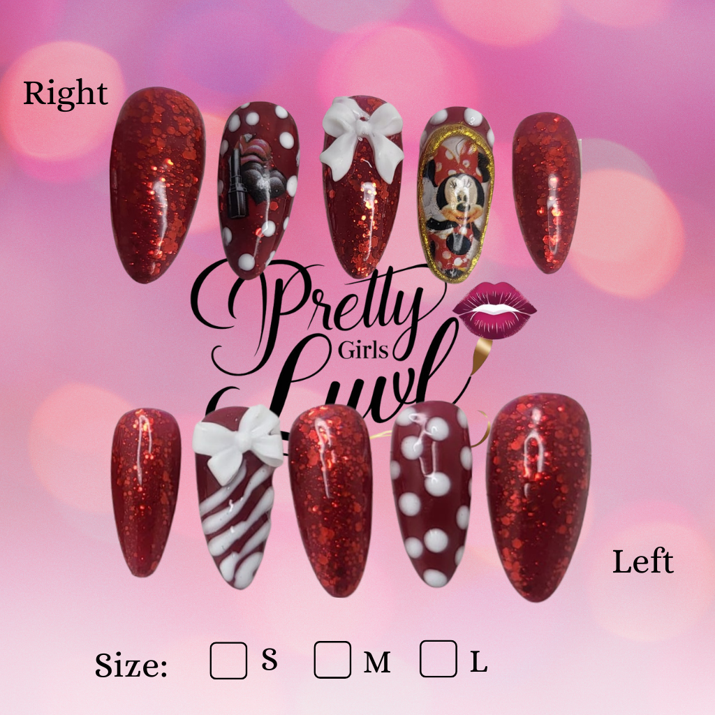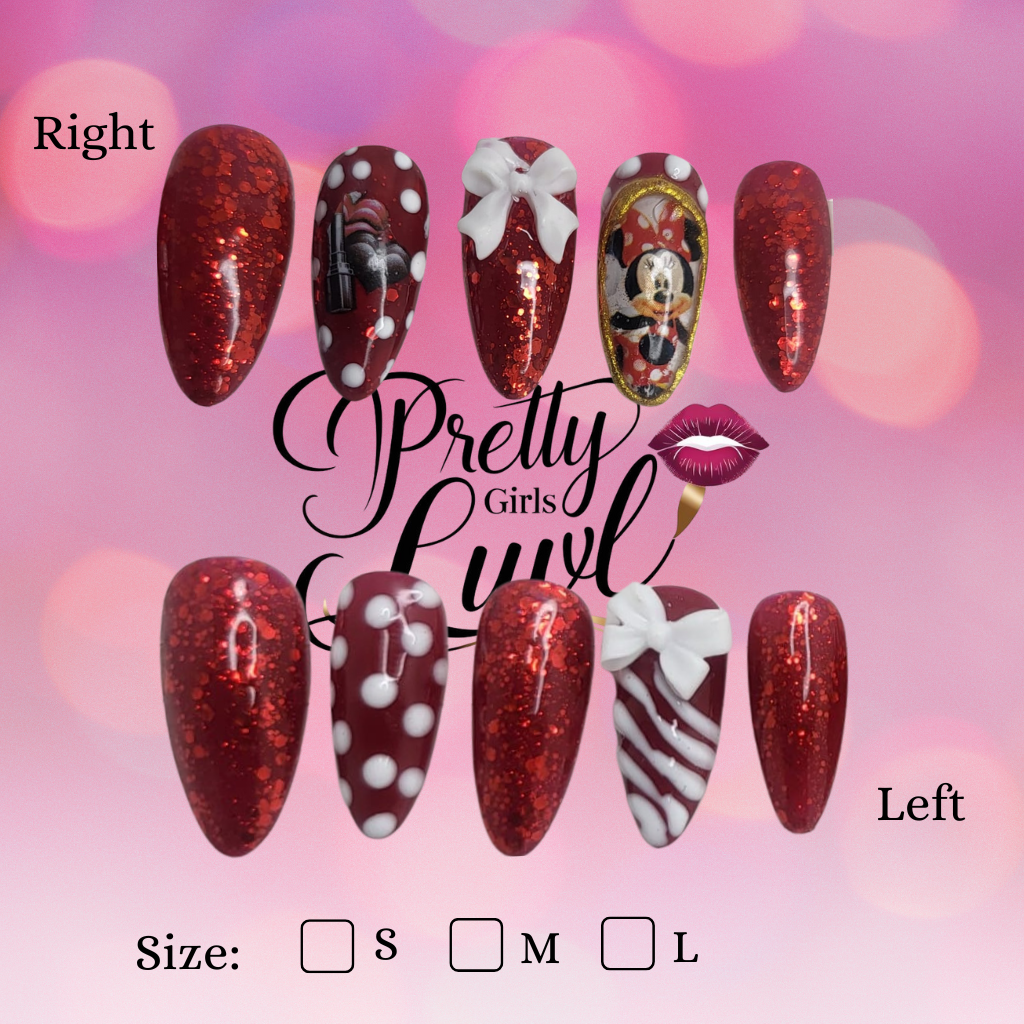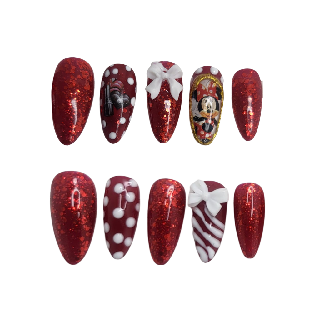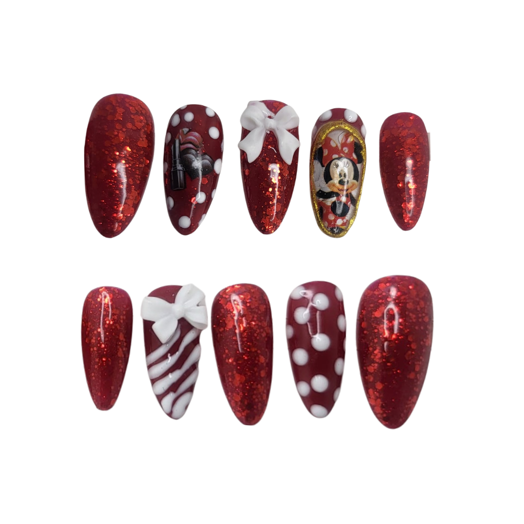 Step into a world of enchantment with the Magic Mouse Mani press-on nail set! This dazzling collection captures the timeless charm of everyone’s favorite mouse with a vibrant red glitter base, playful white polka dots, and whimsical candy cane stripes. Each almond-shaped nail is a miniature celebration, featuring delicate 3D bows and an iconic hand-painted mouse character. Perfect for your next trip to the magic kingdom, a themed party, or just to add a touch of nostalgic sparkle to your everyday, this reusable set will bring joy to your fingertips.