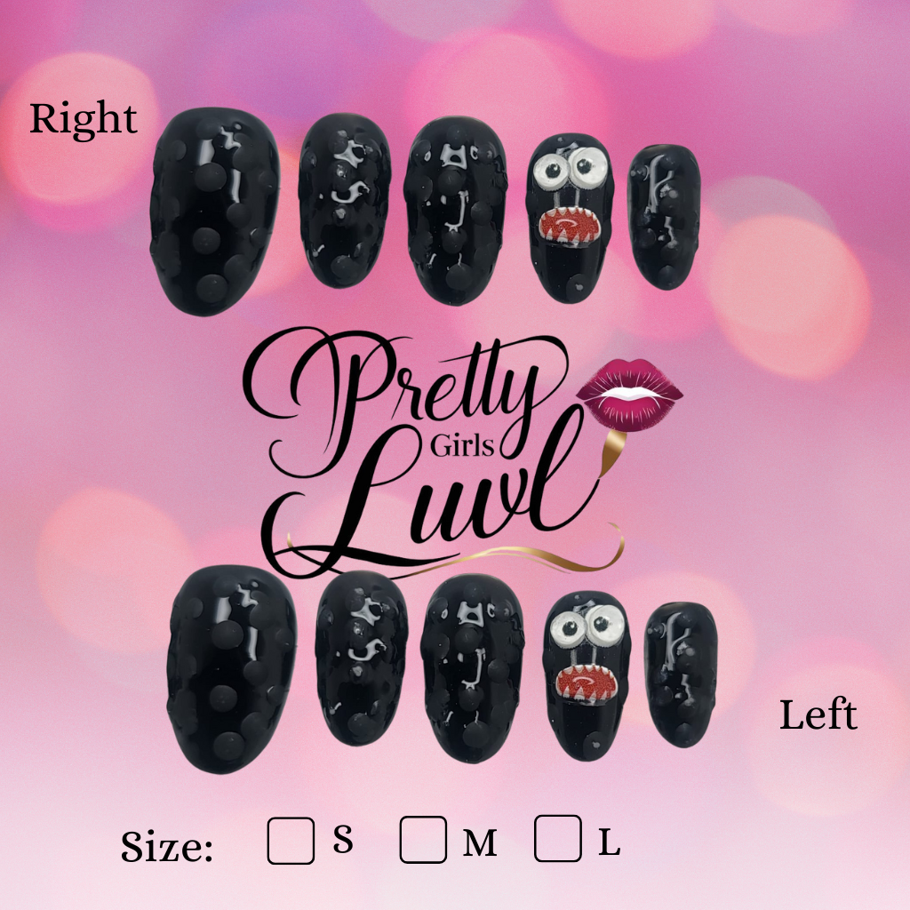 Step up your style with our “Midnight Monsters” press-on nails. This unique and playful black set features a mix of glossy and textured finishes, with a bold and whimsical “monster” design on two of the nails. Each nail is meticulously adorned with a mix of spooky and shimmering accents, including eyes and mouths, to give you an edgy and glamorous look thatās perfect for any occasion.